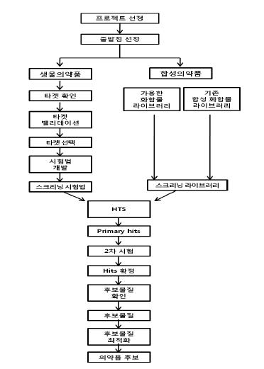 질병표적인 생물학적 target이 확정되면 적합한 신약후보물질의 합성을 통하여 hit 화합물을 도출하거나, 기존에 구축된 화합물 library로부터 target에 작용하는 hit 화합물을 발굴한다. 또는 천연물의 추출 및 생물학적 생산을 통하여 target에 작용하는 hit 화합물을 얻는다. 얻어진 물질의 in vitro 효력, 독성, ADME 스크리닝, in vivo 효력시험 등의 결과를 바탕으로 hit 화합물의 최적화 과정을 통하여 lead 화합물을 발굴하고 다시 최적화 과정을 통하여 신약으로서의 요건을 갖춘 후보물질(candidate)을 도출하고 확정한다.