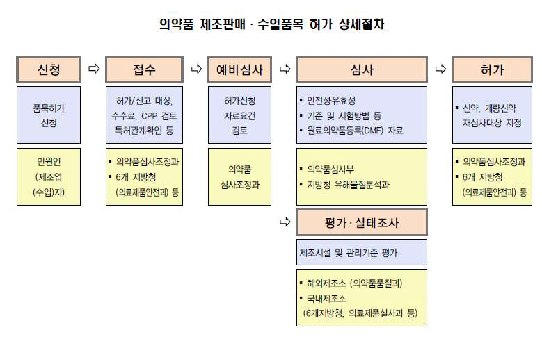 신약의 임상시험을 모두 마치고 제조.품목허가신청을 하면 식품의약품안전처에서는 민원의 접수를 받은 다음 예비심사를 수행한다. 예비심사를 통과하면 각 부서별로 의약품허가.심사 약사법 등 법령과 규정에 의하여 안전성과 유효성심사, 기준 및 시험방법심사, 원료의약품등록자료 심사, 제조 및 품질관리에 관한 자료심사와 더불어 제조소에 대한 GMP 제조시설 및 관리기준을 평가하고 필요시 중앙약사심의위원회에 부의하여 자문을 요청하여 얻은 다음 재심사여부를 결정하고 품목허가를 주게 된다.