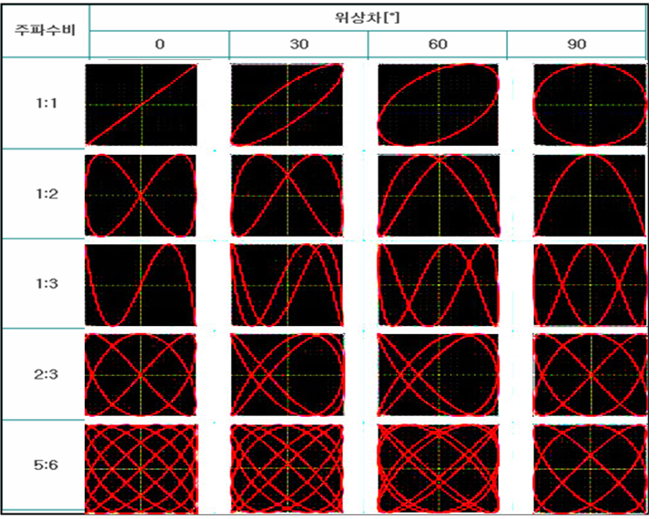 1. 주파수를 이미 알고 있는 신호를 Oscilloscope의 수평축에 입력한 후 측정하려 하는 신호를 수직 축에 접속, 생성된 패턴으로 두 주파수의 비를 알수 있다.