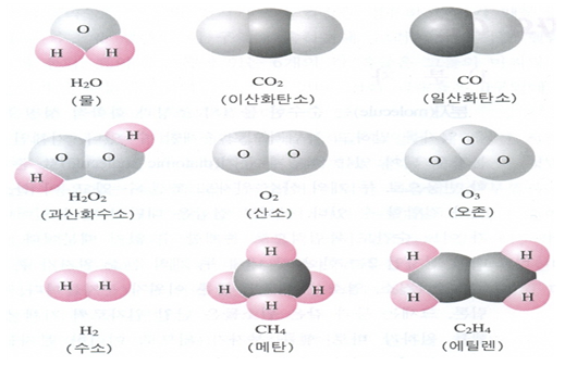 수소, 질소, 염소 분자들도 물론 이원자 분자들이다. 반면 헬륨, 네온, 아르곤, 크립톤, 크세논 등과 같은 원소들은 단일 원자로써 기체상태로 존재한다. 즉 헬륨은 헬륨 원자가 바로 헬륨 분자가 되므로 이러한 분자들을 단원자 분자(monoatomic molecule)라고 한다. 황과 인처럼 두 개보다 많은 원자를 갖고 있는 분자 즉, 다원자 분자(polyatomic molecule)인 원소들도 있다(그림 1 참조).