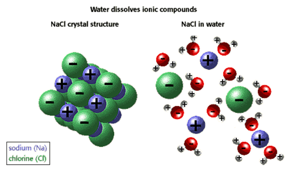 염화나트륨은 Na+ 이온과 Cl- 이온으로 구성되기 때문에 반대전하 사이에는 정전기적 인력이 작용하는데 이 결합을 이온결합(ionic bond)이라고 한다. 하전된 입자에 기인하는 인력은 모든 방향으로 작용하며 지정된 하나의 이온은 무수한 반대 하전 이온을 끌어당길 것이다. NaCl 고체의 구조는 X선 연구로 결정되었고 이때 얻은 결과로부터 반대로 하전된 입자가 규칙적으로 배열된다는 모형이 제안되었다(그림 1 참조). 이 모형은 알려진 NaCl의 성질을 아주 잘 설명해준다. 이 고체물질은 전기를 통하지 않지만 NaCl이 녹거나 물에 용해되면 구성이온들은 외부전위의 영향을 받아 자유로이 움직이며 전기를 통한다. NaCl의 물리적인 상태는 결정성이며 이 결정은 이온의 규칙적인 기하학적 배열로 이루어진다.