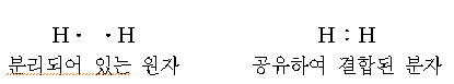 수소 기체와 같은 2원자 분자의 존재를 설명하기 위해서는 다른 모형이 필요하다. 2개의 원자가 동일하므로 반대로 하전된 이온들의 생성은 기대할 수 없다. 2개의 수소 원자가 수소 분자에서처럼 가까이 접근되었을 때 그것들의 전자는 쌍(pair)을 이룬다. 이 전자쌍은 두 원자에 의해서 공유된다. 두 원자가 한쌍의 전자를 공유함으로써 생기는 결합을 공유결합(covalent bond)이라 한다.