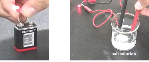 5) 비커에 들어있는 소금을 회로의 일부분이 되게 연결하고 LED에 불이 들어오나 본다.