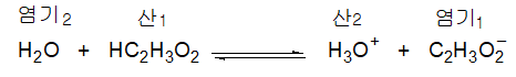 이 반응에서 H2O는 산으로서 염기인 NH3에 양성자를 제공한다. 또한 역반응에서 암모늄염의 용액은 알칼리에 양성자를 제공하여 암모니아 기체를 발생시킨다. BrΦnsted-Lowry 이론에 의하면 산과 염기는 분자일 수도 있고 이온일 수도 있다. 염기인 NH3가 양성자를 받아 산인 NH4+이 되고 산인 NH4+이 양성자를 잃어 염기인 NH3가 되는데 양성자를 얻고 잃는 이 두 산-염기 쌍을 짝쌍(conjugate pair)이라고 한다. NH4+은 NH3 염기의 짝산이고 NH3은 산 NH4+의 짝염기이다. 같은 원리로 산 H2O와 염기 OH-도 또한 짝쌍이다. 짝 관계를 첨자를 사용하여 표시하면 다음과 같다.