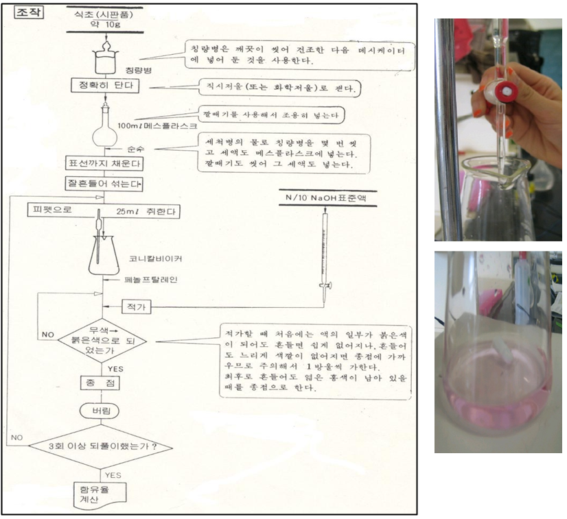 식초를 1/10N 수산화나트륨으로 적정하고 아세트산의 함유율을 구한다.