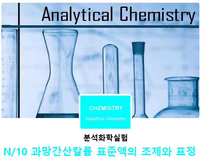 1. 실험 목적 1.1. 약 N/10 과망간산칼륨 용액을 조제하여 N/10 옥살산나트륨 표준액(1차표준액)을 사용하여 표정한다. 2. 실험 이론 및 원리 2.1. 실험 배경 는 높은 순도의 시약을 얻을 수 없을 뿐만