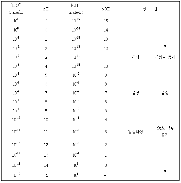 순수한 물은 중성으로서 [H3O+]와 [OH-]는 같다. 만약 물에 [H3O+]을 증가시키는 물질을 더하면 Le Châtelier의 원리에 의하여 [OH-]는 감소해야만 한다. 산성 용액에서는 [H3O+] > 1×10-7mole/L이고 알칼리성 용액에서는 [OH-] > 1×10-7mole/L 이다. 따라서 H3O+ 농도가 크면 클수록 용액은 강한 산성이며, OH-의 농도가 크면 클수록 용액은 강한 알칼리성이다.
