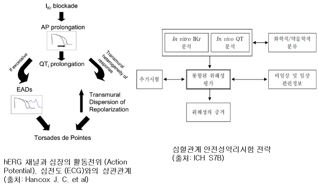 그림 1은 심혈관계 안전성약리시험들의 상호관계를 나타낸 것이다. 그림에서 보는 바와 같이 hERG 채널전류가 약물에 의해서 억제가 되면 심실의 활동전위 간격(duration)에 영향을 미치고 이는 심장에서 심전도의 QT파 연장을 초래하는데 이를 QT-prolongation이라고 한다.