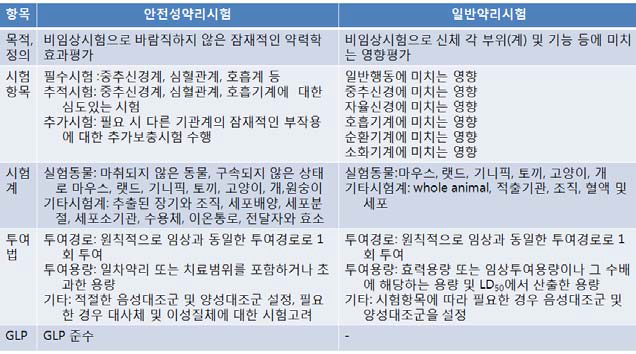 이러한 일반약리시험과 안전성약리시험의 목적은 모두 인체에서의 안전성과 관련이 있는 바람직하지 않은 약력학적 특징을 규명하고, 독성시험 또는 임상시험에서 관찰되는 물질의 약력학적 또는 병태생리학적 부작용을 평가하며, 관찰되거나 의심이 가는 약력학적 부작용의 기전을 조사하기 위한 것이다. 식품의약품안전처에서는 ‘의약품등의 약리시험기준 (식약처 고시 제2013-232호(2013.10.30., 개정))’에서 의약품 등의 일반약리시험과 안전성약리시험의 항목과 시험방법 규정하고 있다.