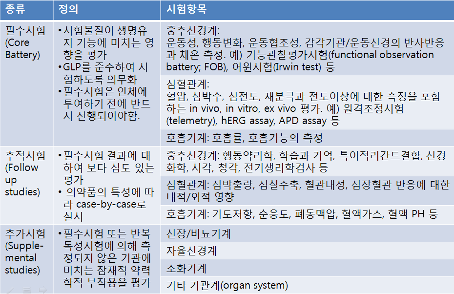 필수안전성약리시험은 시험물질이 생명유지 기능에 미치는 영향을 평가하는 것으로서, 일반적으로 생명유지 필수기관인 심혈관계, 호흡기계 및 중추신경계에 대하여 다음과 같이 평가를 수행한다. 과학적 타당성에 근거하여 필수시험을 보충할 필요가 있거나(8항 참조), 필수시험이 불필요할 수도 있다(9항 참조). 특정한 시험이나 특정 기관, 계 또는 기능에 대한 시험을 제외할 경우 과학적 타당성을 명시하여야 한다.