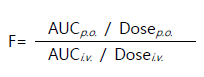 전신순환계에 도달하는 약물의 용량을 나타내는 비율이며, 특히 정맥투여 대비 다른 투여경로의 AUC값으로부터 그 값이 결정된다. 경구투여의 경우를 예로 들면 다음과 같은 식에 의해서 생체이용률 값을 계산할 수 있다.