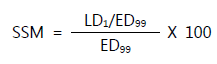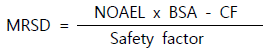 실험동물 종에서의 무독성용량(NOAEL)을 기준으로 적절한 체표면적변환인자(body surface area conversion factor, BSA-CF)를 곱하여 사람등가용량(HED)에 해당하는 사람에서의 예상 무독성용량(NOAEL)을 구한다.