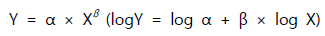 여기에서 Y는 클리어런스나 분포용적 동의 해당되는 체내동태 파라미터를 의미하며, X는 체중과 같은 생리학적 파라미터를 의미한다. 알로메트릭 계수(a)와 알로메트릭 지수(ß)는 위의 식 중 로그변환한 값을 이용하여 그림을 그려보면 기울기와 절편으로부터 구할 수 있다. 사람과 다른 동물종 간의 비교를 위해서 체중 혹은 체표면적을 이용하여 외삽 기법을 적용하여 체내동태 파라미터를 예측할 수 있으며, 이러한 약물용량의 예측 계산 근거에는 생체에서의 약동력학적 특성을 적용하여 단순화시킬 수 있기 때문이다.