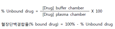특히 단백결합율이 높고 좁은 치료영역을 가지는 약물들은 자유 혈장 농도를 구하여 체내동태를 파악하는 것이 약효와 독성을 모니터링 하는데 더 효율적일 수 있다. 약물의 단백결합율 측정을 위해서 평형투석법(equilibrium dialysis method)을 이용하여 단백질과 결합하고 있는 약물과 유리형 약물 비율을 측정하여 그 값을 구하고 평가한다. 평형투석법에 의한 혈장단백결합율은 다음과 같은 식을 통하여 구할 수 있다.