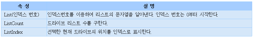 시스템에 설치되어 있는 모든 드라이브의 리스트를 가지는 콤보박스입니다. 사용자는 프로그램 실행 중에 이 콤보박스를 사용하여 드라이브를 선택할 수 있습니다. 이 때 선택된 드라이브는 ListIndex속성을 이용하여 드라이브의 위치를 알아낼 수 있고, List속성을 이용하여 선택한 문자열을 알아 낼 수 있습니다.