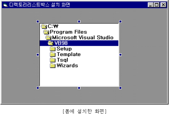 디렉토리 리스트박스 컨트롤의 경로(Path)를 지정하지 않으면 현재 작업중인 디렉토리로 지정이 됩니다. 초기의 디렉토리를 설정하려면, Path속성에 디렉토리 경로를 문자열 형태로 넣어 주면 됩니다.