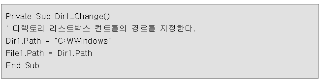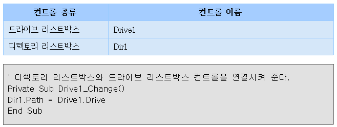위 소스와 같이 연결하면, 드라이브 리스트박스 컨트롤에서 드라이브를 변경하면 디렉토리 리스트박스 컨트롤의 디렉토리가 자동으로 변경됩니다.
