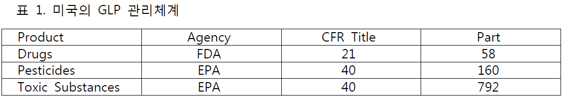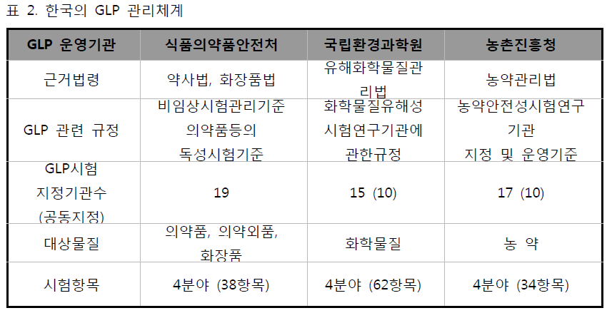 한국의 GLP는 표 2에서 제시된 바와 같이 3개기관에서 별도의 법적근거를 갖고 운영되고 있다. 여기서는 식품의약품안전처의 비임상시험관리기준을 바탕으로 기술한다.