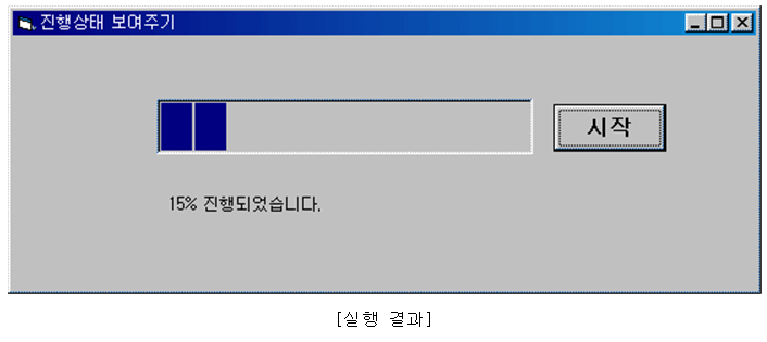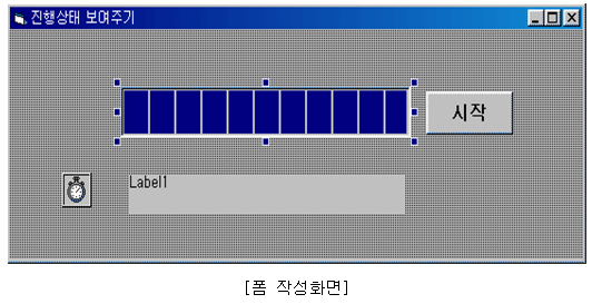 타이머를 이용하여 1초에 한번씩 진행상태를 문자열과 프로그래스바로 보여주는 프로그램입니다. 폼에 타이머, 명령버튼, 라벨, 프로그래스바를 설치하고 다음과 같이 작성합니다.