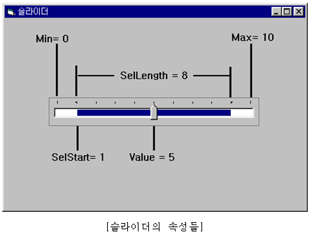 슬라이더의 범위는 Min, Max속성을 이용하여 설정합니다. Min속성이 0이고 Max속성이 100이면 0 ∼100 사이에 범위가 설정됩니다. 슬라이더 안쪽은 하얀색으로 되어 있는데, 다른 색으로 구간 범위를 주어 차별을 둘 수 있습니다. 그렇게 하려면 SelStart속성을 이용하여 시작위치를 설정한 후 SelLength속성을 이용하여 SelStart속성 기준부터 구간의 길이를 설정하면 됩니다.