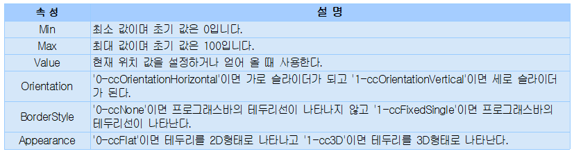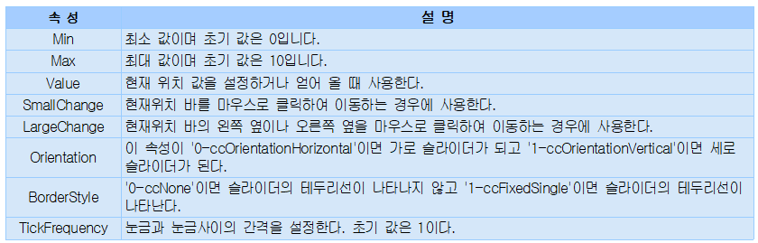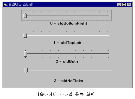 슬라이더 컨트롤은 스크롤 바 컨트롤과 비슷하게 시각적으로 현재 위치를 나타날 때 사용합니다. 슬라이더의 특징은 눈금이 있어 움직인 위치를 쉽게 알 수 있습니다. 또한, 다양한 모양의 슬라이더 스타일을 나타낼 수 있습니다. 스타일을 바꾸려면 TickStyle 속성을 이용하여 다음과 같은 4가지 형태로 바꿀 수 있습니다. 위 화면은 가로형태로 슬라이더가 출력되었지만 세로 형태로 출력하고 싶으면, Orientation속성을 `1-ccOrientationVert