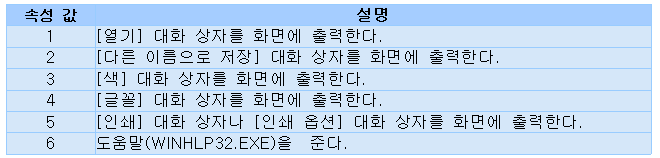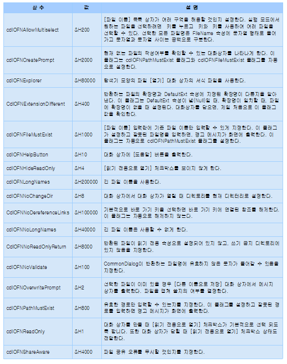 Flag속성은 열기 대화상자를 사용자에는 제한을 두거나 여러 파일을 선택할 수 있는 기능들을 추가하거나 제거 할 수 있는데, 내용은 다음과 같습니다.