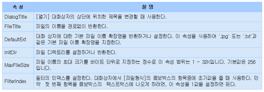 Filter속성으로 지정된 필터는 [열기] 대화상자의 [파일형식]의 콤보박스에 등록되어 선택할 수 있습니다.