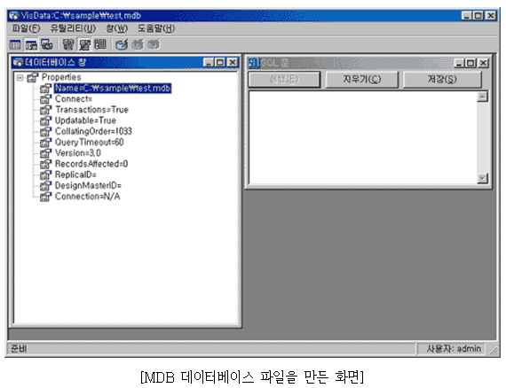 [Version 7.0 MDB]을 선택하면 새로운 데이터베이스를 만드는 대화상자가 화면에 나타납니다. 그러면 새로운 데이터베이스의 경로를 지정한 후 새로운 이름을 만들면 됩니다. 'text.mdb'파일을 만들어 보면 다음과 같이 나타납니다.