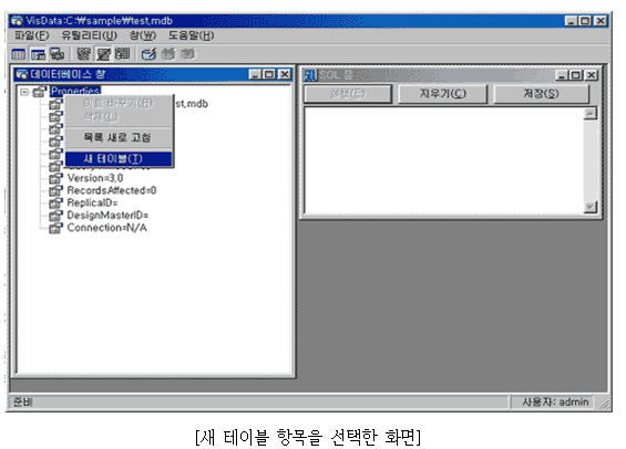 속성(Properties)의 [Name]에 자동적으로 디렉토리경로와 파일명이 자동으로 등록되어 있습니다. 데이터베이스 파일을 새롭게 만들거나 읽어오면, [데이터베이스 창]과 [SQL문]이 화면에 출력합니다. [데이터베이스 창]은 데이터베이스의 속성을 보여주고 새로운 테이블을 만들 수 있게 해줍니다. [SQL]문은 작성한 데이터베이스나 읽어온 데이터베이스를 SQL문 이용할 때 사용합니다. SQL문장을 작성한 후 [실행]버튼을 누르면 수행합니다. [데이터베이스] 창에서 마우스 오른쪽 버튼을 누르면 팝업메뉴안에 [새 테이블]이라는 항목이 있습니다.