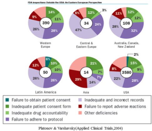 미국 FDA가 시행한 실사 결과 지역마다 차이가 있으나 가장 흔하게 발견되는 GCP 위반사항은 임상시험 관련 기록의 미비 (inadequate and incorrect records), 계획서 미준수 (failure to adhere to protocol), 이상반응 보고 절차 위반 (failure to report adverse reactions)이었습니다.