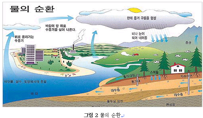 대기, 지표, 지하에서의 물은 상호 밀접한 관계를 유지하면서 매우 복잡한 계(system)를 형성하고 있다. 이러한 물의 순환은 대규모 순환(major cycle)과 소규모 순환(minor cycle)으로 나누어진다. 대규모 순환은 해상에서 증발한 수증기가 강수로 되어 육지로 이동하며, 다시 지표수나 지하수로서 돌아가는 순환을 말한다. 그리고 소규모 순환은 육지에서의 증발이나 강수 중에서의 승화(sublimation)등으로 생기는 부분적인 순환을 말한다(그림 2 참조).