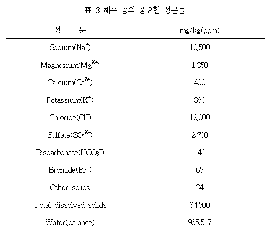 해수에는 주로 염화나트륨(3.5w/w%)이 들어있으며 그 외 70가지 이상의 원소들이 대부분 미량으로 존재한다. 해수는 NaCl, Br2, Mg 등을 얻을 수 있는 공업적 자원과 해저로부터는 U, Mn 등의 광물을 얻을 수 있다. [표 3]에 해수 중의 중요한 이온들을 나타내었다.