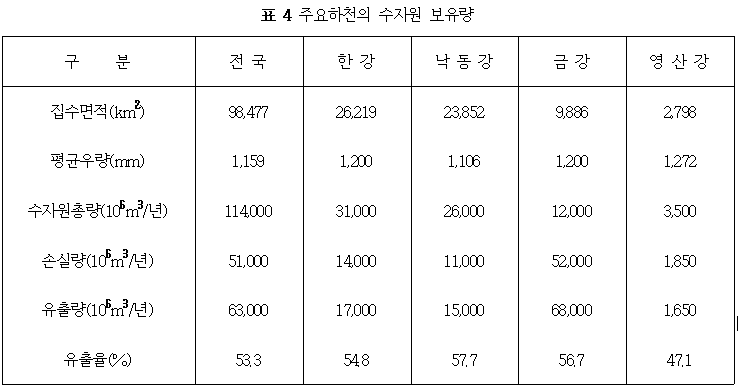 우리나라 총 수자원량 중 42%에 해당하는 532억㎥가 침투 및 증발 등에 의해서 손실되며 나머지 58%인 735㎥가 하천을 통하여 유출된다. 하천 유출량 중의 61%가 홍수시에 유출되며, 평상시의 유출은 39% 정도이다. 또 실제 이용하는 하천수의 양은 하천 유출량 735억㎥중 19%에 해당하는 140억㎥에 불과하므로 수자원의 효율적인 이용 측면에서 수질원을 더 개발하여야 한다. 우리나라 주요 하천의 수자원 유출량은 한강이 연간 약 170억㎥, 낙동강이 150억㎥, 금강이 68억㎥, 영산강이 16.5㎥이다(표 4 참조).
