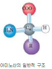 모든 아미노산에는 최소한 두개의 functional group이 붙는다. 그것은 -COOH(carboxyl group)과 -NH2(amino group)이다. 아미노산이란 이미 여러분이 아는 바와 같이 α탄소(유기화학을 소홀히 한 사람은 약오르겠지?)에 carboxyl group, amino group, R group, 수소원자가 붙어 있는 것으로서 이것이 바로 아미노산의 정의이다. R group의 종류에 의해 아미노산의 종류가 결정된다. 모든 아미노산(단, glycine은 예외)에는 L형과 D형이 있는데 자연계에 압도적으로 많고, 인체내에서 효과적인 작용을 나타내는 것은 L형이다.