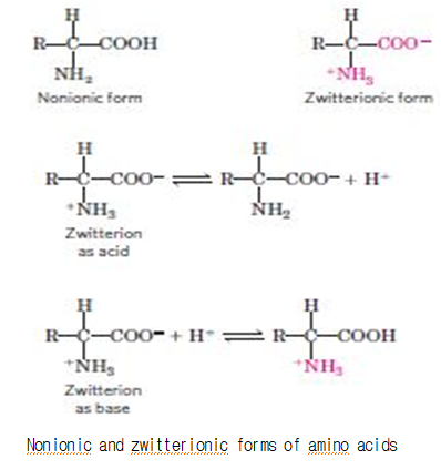 아미노산은 자신의 등전점(pI)보다 낮은 pH에서는 대부분이 양이온(-NH3+,-COOH)으로 존재하고, 등전점에서는 zwitterion(-NH3+,-COO-) 상태, 등전점보다 높은 pH에서는 음이온(-NH2,-COO-)으로 존재한다(zwitterion이라는 새로운 용어를 잘 기억해둘 것). 여러 가지 아미노산은 그 종류에 따라 고유한 등전점을 가지며 이는 여지전기영동(paper electrophoresis)에 의해 아미노산을 분리하는데에 이용된다. 말하자면 각각의 아미노산은 종류마다 그 등전점이 다르므로 같은 pH에서 서로 다른 전하를 띠게 되고, 이를 이용하여 전하의 차이에 의해서 아미노산을 분리하는 것이다.