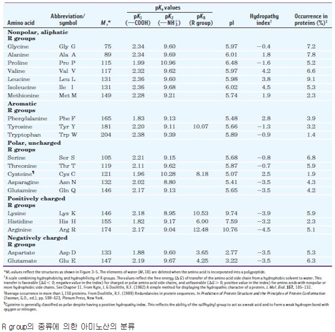 R group에는 어떤 것들이 있을까? 그야말로 다양하다. 수소일 수도 있고(glycine), methyl group일 수도 있다(alanine). 이 R group이 비슷한 것끼리 묶어서 아미노산을 분류한다. 다음은 그 표이다. 그 표의 내용을 보고서도 약만 오르는 사람도 있겠지만 유기화학적인 것은 절대 상술하지 않겠다.
