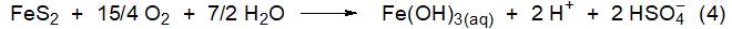 황화철은 산소가 존재하지 않으면 안정적이다. 채굴로 석탄층이 공기 중의 산소와 접촉하면 (1)식의 산화반응이 일어나서 다량의 산이 생긴다. 이 반응은 채굴이 끝난 다음에도 오랫동안에 걸쳐 진행되므로 광산 부근의 많은 하천이 황산으로 오염되어 심각한 문제가 된다. 광산에서 산성인 물을 완전히 제거하려면 경비도 많이 들고 또한 기술적으로도 어렵다. 그러므로 광산에서 발생될 수 있는 환경 오염은 설계된 작업으로 출구에서부터 미리 제거시켜야만 한다.