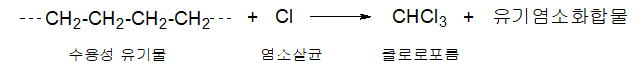 수돗물의 정수장에서 살균 소독제로 염소나 염소화합물(NaOCl)등을 사용하고 있다. 그러나 염소는 수중에 있는 유기물과 반응하여 유해한 유기 염소화합물을 생성한다. 미국환경보호청(EPA)이 미국 전국에 걸쳐 조사한 결과 거의 모든 수도가 chloroform으로 오염되어 있음을 알았다. 따라서 EPA는 음용수의 chlorform 규제값을 100ppb 이하로 제한하고 있다.