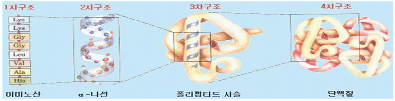 내친김에 다 한번 찾아보자. 2차구조란 나선 또는 병풍형으로 1차구조가 접혀지고, 꼬인 모양을 의미한다. 3차구조란 단백질을 구성하는 펩타이드(peptide) 사슬들이 심하게 구부러져서 조밀한 3차원 구조를 이룬 것을 의미하며, 4차구조란 서로 다른 펩타이드(peptide) 사슬이나 단백질 분자들이 접합하고 있으면서 각각의 구성 단위가 명확히 구분지어 질 때 이를 특별히 구분하여 단백질의 4차구조라고 부르는 것이다.