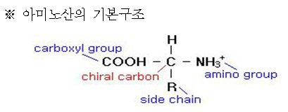 아미노산은 부제탄소(chiral C)에 카르복실기와 아미노기가 결합된 일반 구조를 갖는다. 이 구조 중 카르복실기와 아미노기가 해당 아미노산이 존재하는 용액의 pH에 따라 존재하는 형태를 변화시킴으로써 염기성이나 산성, 중성으로 작용하기도 한다. 따라서 아미노산은 양쪽성 이온이라 할 수 있다.