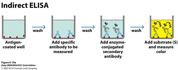 A. 항체를 검색하거나 그 양을 결정 할 수 있다. 일차 항체를 함유하는 혈청 또는 기타 다른 시료를 항원이 부착된 측정판에 넣고 항원과 반응 시킨다.