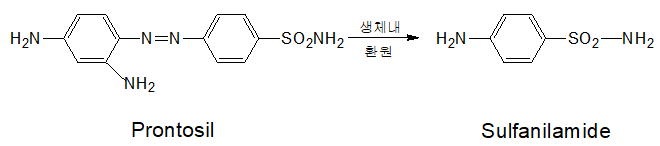 독일의 I. G. 염료회사 연구소의 약리학자였던 Gerhard Domagk는 1935년 프론토실(Prontosil)이라는 염료가 병원균에 감염된 쥐에 대하여 치료효과가 있다는 사실을 발견하였다. Domagk는 프론토실이 생체밖(in vitro)에서는 항균 활성이 없지만 생체내(in vivo)에서는 대사되어 항균 물질인 설파닐아미드(sulfanilamide)로 변한다는 사실을 발견하였다.