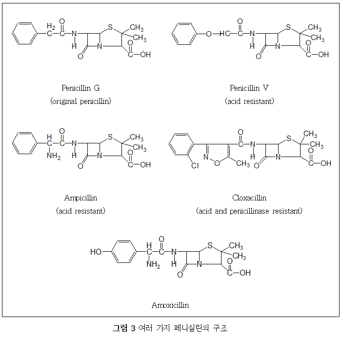페니실린 G는 식도를 통하여 복용하게 되면 위산에 의해서 파괴되므로 주사제로 사용해야 한다. 세균은 또한 페니실린에 대해서 내성을 갖게 되었다. 이러한 문제를 해결하기 위하여 [그림 3]에서 보는 바와 같이 다른 페니실린을 개발하게 되었다. 아목시실린(amoxixillin)은 식도를 통한 복용이 가능하고 많은 종류의 박테리아에 대해서도 효과적이다.