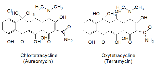 1945년 B.M. Duggan은 스트렙토마이세스 오레오파시엔스(streptomyces aureofaciens)라고 하는 황금빛 곰팡이를 발견하였다. 이 곰팡이에서 최초로 네개의 고리 구조를 갖는 테트라사이클린(tetracycline) 계통의 오레오마이신이라고 하는 새로운 항생제를 얻었다. 화이저(Pfeizer) 연구소는 116,000종의 토양을 검사하여 제2의 테트라사이클린계 항생제인 테라마이신(terramycin)을 발견하였다.
