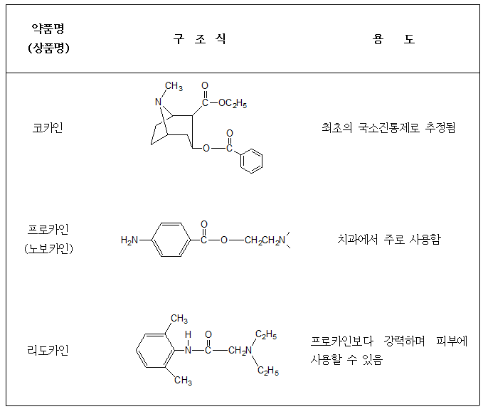 국소 진통제는 뉴론 막의 Na+과 K+ 이온 통로를 막아서 통증이 전달되는 것을 차단한다. 국소진통제에는 남아메리카산 코카나무 잎에서 얻은 천연산 코카인(cocaine)과 잘 알려져 있는 노보카인(novocain)이 있다(표 1 참조).