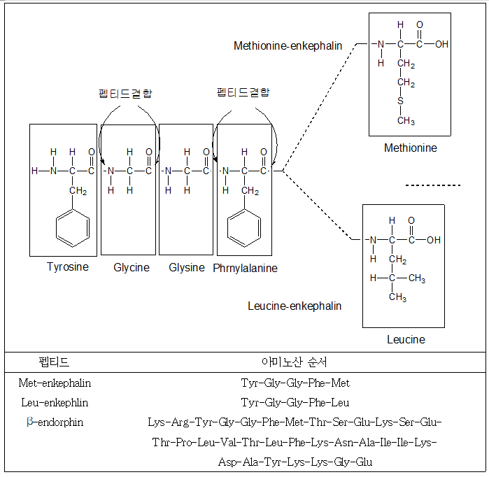 오랜 기간 동안 과학자들은 뇌속에서 아편제의 기능과 사람이 통증을 느끼는 과정 사이에 있을 수 있는 가능한 관계들을 추적하였다. 존스 홉킨스(Johns Hopkins) 대학의 Solomon Snyder와 공동연구자들은 1973년 뇌와 척추 중에는 자물쇠에 열쇠를 끼워넣는 것처럼 아편제를 끼워넣는 특수한 신경전달 물질이 있다는 것을 발견하였다. 1975년 스코틀랜드 Aberdeen 대학의 John Hughes와 Hans Kosterliz는 돼지의 뇌로부터 아편제의 활성을 갖는 2개의 펩티드를 분리하였다.