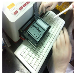 6) 1열로 쭉 7개의 well에 template DNA 5㎕와 Universal bacteria primer가 들어있는 master mix 15㎕를 loading한다. 맨 밑에 대조군으로 한 well에 DW 5㎕와 master mix 15㎕를 넣는다.